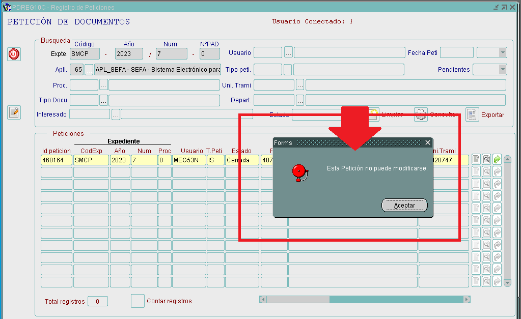 Una vez entramos, el sistema nos indica que no podremos hacer ninguna modificación a la documentación solicitada, solo consultarla.