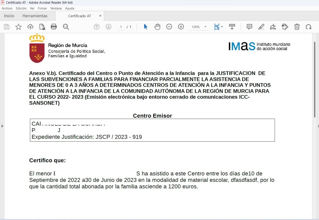 (1) DATOS DEL CENTRO CAI/PAI: Nos mostrará el nombre del centro y el CIF/NIF de la entidad emisora del certificado (de tener algún datos mal contacte con geas-imas@listas.carm.es).