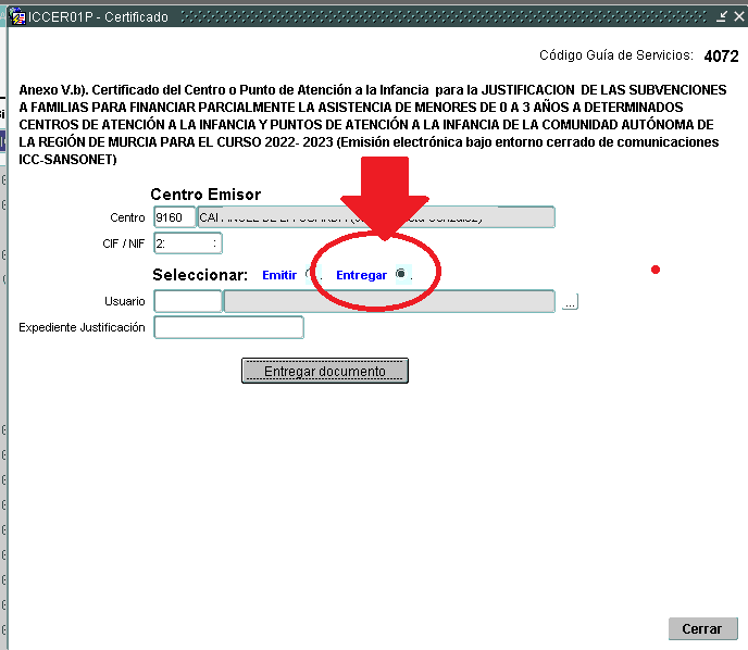 Nos muestra una primera pantalla donde nos indica el CAI/PAI en el que estamos y nos dá a elegir si queremos EMITIR (FASE I) el certificado o ENTREGAR una vez firmado electrónicamente.