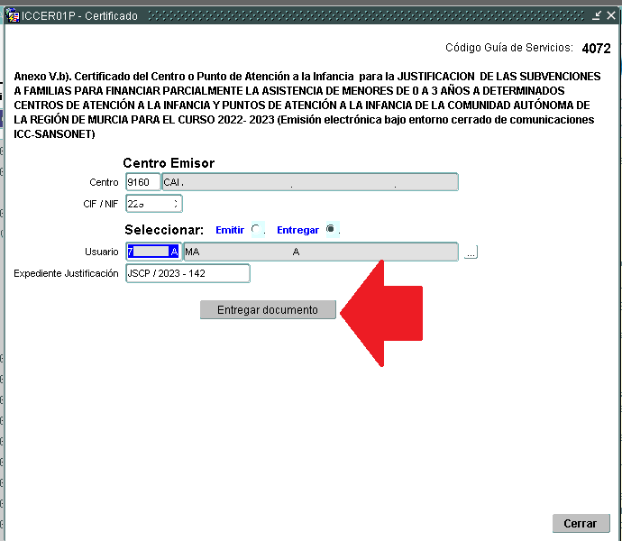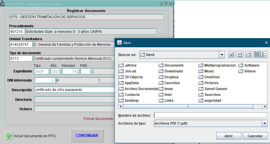 Con el botón de ENTREGAR DOCUMENTO continuaremos con el proceso de adjuntar documentos. Nos mostrará un formulario de entrega de datos interior, donde nos aparecerán una serie de datos rellenos, el sistema tan solo nos pedirá que metamos una breve descripción del documento a adjuntar, como por ejemplo: «certificado del niño perez perez». Una vez concluido, pulsaremos el botón CONTINUAR.