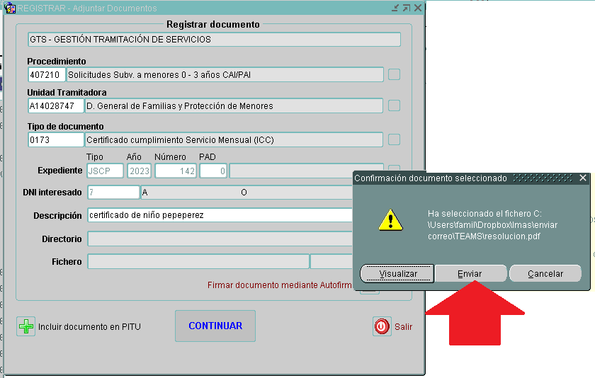 Una vez seleccionemos el archivo nos mostrará una pantalla de dialogo donde nos solicitará con varios botones, si deseamos visualizar el documento que vamos a enviar previamente (VISUALIZA), si deseamos ENVIAR, o por el contrario si no hemos equivocado de archivo cancelar el envio (CANCELAR).