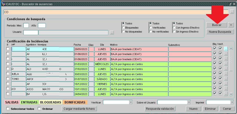 Una vez hayamos pulsado esta opción, el sistema nos llevará al formulario de Gestión de Incidencias, donde se gestionan, evalúan y visualizan las incidencias. Este formulario permite muchas funciones, pero para la autovalidación de las incidencias, solo es necesario entrar en él, y visualizar su contenido. Para ello una vez dentro del formulario solo basta con pulsar la el botón de buscar para que muestre el contenido y se AUTOVALIDARAN las incidencias que estén pendientes.
