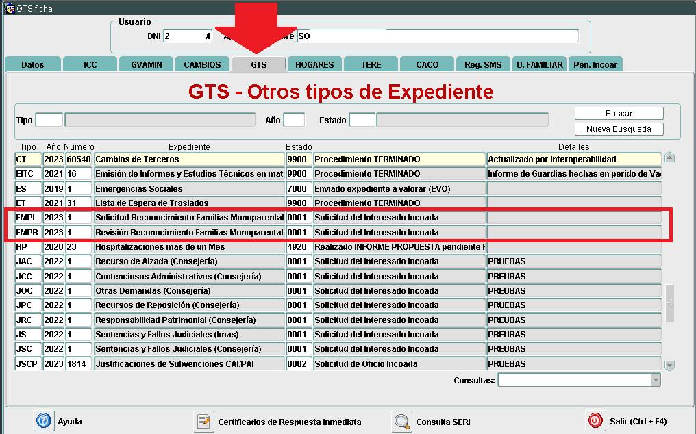 En VISI/SUSI en la Consulta del Historial Social podremos encontrar en la pestaña de GTS, los expedientes FMPI de solicitud inicial y expedientes FMPR de Revisiones.