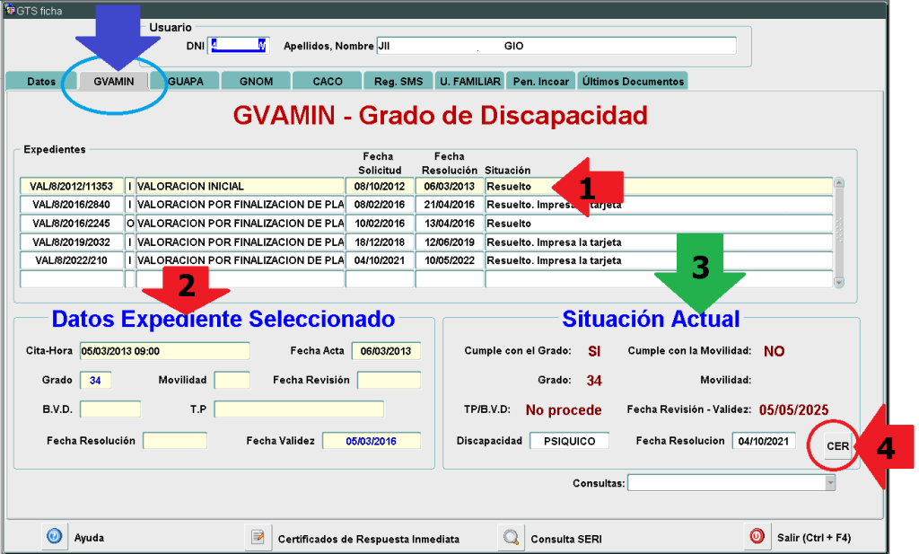 Asi pues, una vez situado en un expediente concreto (1), el bloque de datos del Expediente Seleccionado (2) nos mostrará los datos concretos del expediente revisado, mientras que el bloque de datos SITUACION ACTUAL (3), nos muestra a la fecha del día de la consulta si procede o no, a tener el grado, movilidad o tercera persona reconocido.