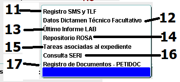 (10) Consultas: posibilidades de información ampliada que nos ofrece este formulario de cada uno de los expedientes seleccionados. Las posibilidades de disponer de más o menos información que puede aportar este cuadro de opciones, depende de los permisos exclusivos que tenga el profesional en la consulta.