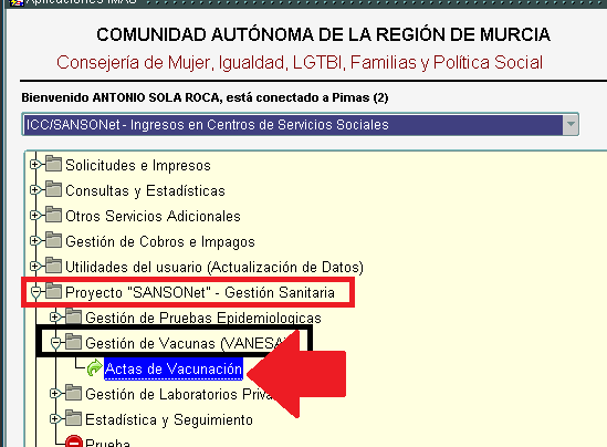 Una vez hemos elegido la opción de PROYECTO «SANSONET», y dentro de este la submenú GESTION DE VACUNAS (VANESA) encontraremos la opción de ACTAS DE VACUNACIÓN.