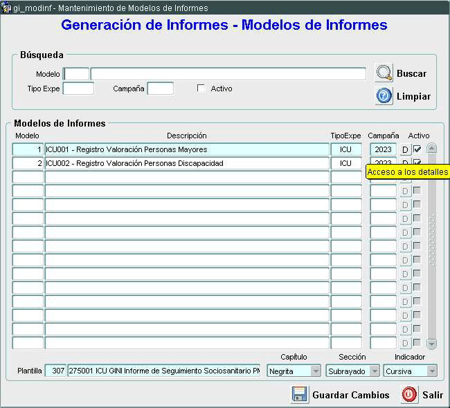 También asociaremos otros conceptos como la plantilla que se utilizará para el informe. La plantilla es el documento base de CARMEN sobre el que se escribirán las respuestas.