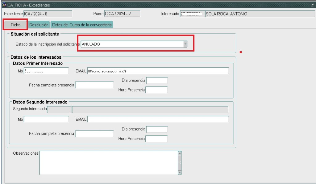 Pulsando el botón «F» de ficha penetraremos en los datos concretos de estas inscripciones, donde podremos ver si está inscrito, anulado o en espera de cada suscripción, si finalmente acudió, o cualquier otro tipo de observación.