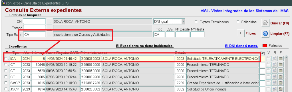 Encontraremos en la pestaña GTS un nuevo expediente, los expedientes ICA. Estos expedientes recogen las distintas inscripciones que el interesado ha hecho en cursos, jornadas, conferencia y actividades sociales.