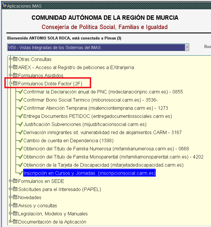 Desde las plataforma SUSI/VISI en su apartado de Formularios doble factor encontraremos un enlace que nos llevará hasta el formulario electrónico de inscripcionsocial.carm.es. Formulario destinado a la inscripción.
