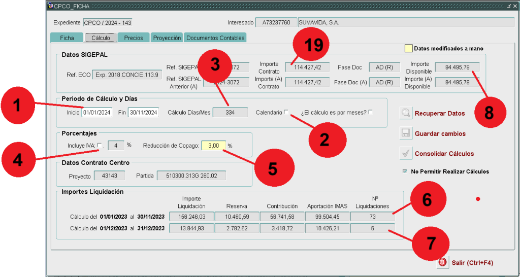 [07] – Cantidades liquidación mes anterior al cálculo . Cantidades obtenidas de las liquidaciones ocurridas el mes anterior a la fecha de inicio del cálculo. Esto es debido a que los importes de la liquidación del mes de diciembre del año anterior son cargados en el presupuesto del año en curso.