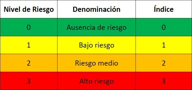 “NIVEL 0” o de ausencia de riesgo, y se representa con el color verde. “NIVEL 1” o de bajo riesgo, y se representa con el color amarillo.