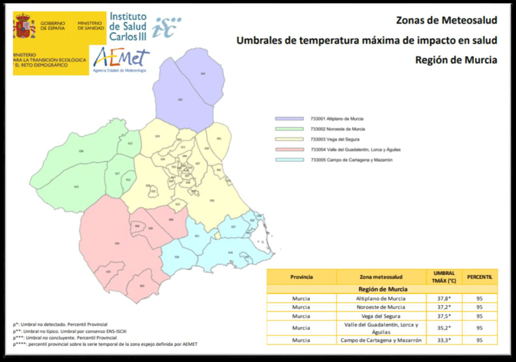 En la Región de Murcia se han definido 5 zonas de meteosalud, que corresponden a áreas de territorio homogéneas desde un punto de vista climatológico en cuanto al comportamiento de las temperaturas diarias. Cada zona de Meteosalud tiene su propia temperatura umbral de impacto en la salud por altas temperaturas. En la siguiente imagen se recogen las 5 zonas de meteosalud y sus correspondientes temperaturas umbrales: