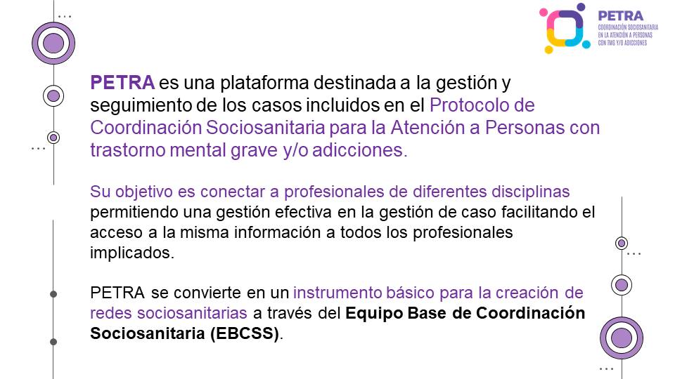 PETRA (Protocolo Electrónico para el tratamiento del Trastorno mental y Adicciones) es una plataforma destinada a la gestión y seguimiento de casos de personas con Trastorno Mental Grave y Adicciones. Es una iniciativa de trabajo conjunto entre la Consejería de Política Social, Familias e Igualdad, la Consejería de Salud y el Servicio Murciano de Salud, financiada e impulsada por el FSE a través de la Dirección General de Servicios Sociales, Tercer Sector y Gestión de la Diversidad. Como colaboradores indispensables para la viabilidad de este proyecto participan Instituto Murciano de Acción Social (IMAS) y los Centros de Servicios Sociales de todas las entidades locales de la Región (Ayuntamientos y Mancomunidades), cuenta también con la participación de entidades del tercer sector.