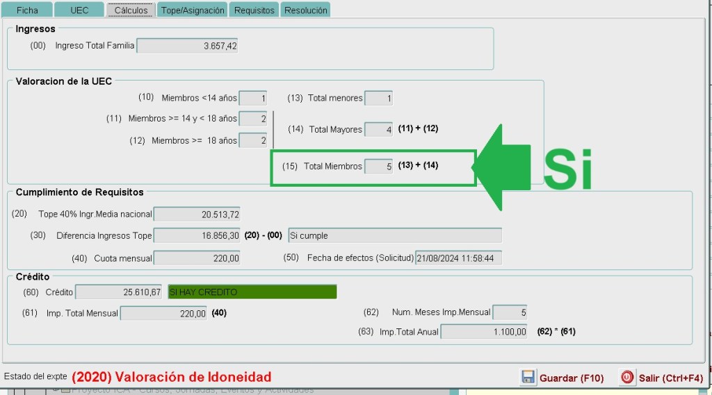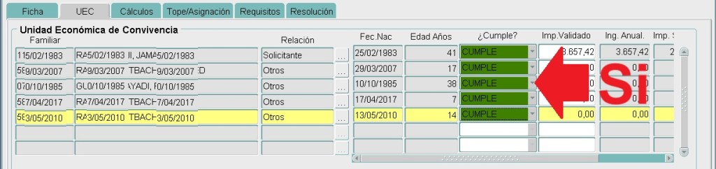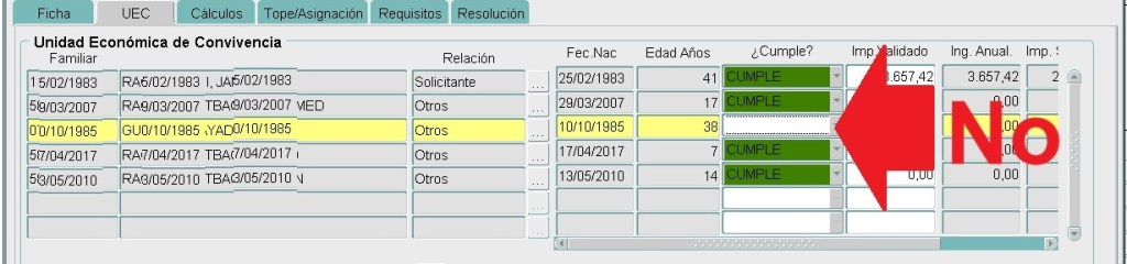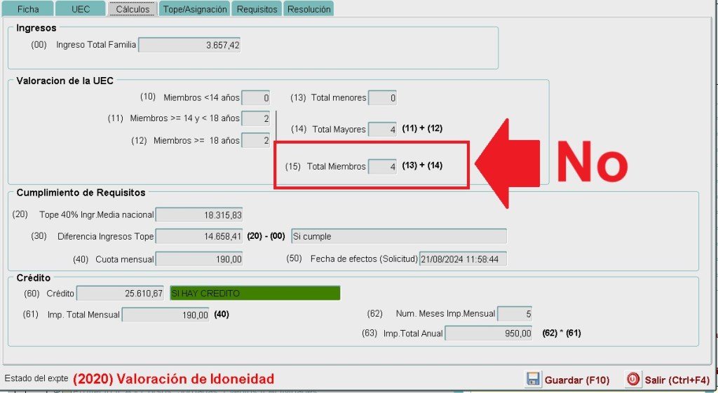 Debe asegurarse antes de Validar que el número de miembros que «CUMPLEN» en la unidad familiar definida por usted, es igual al número de miembros que el sistema había computado en la pestaña de Cálculos (), ya que de ser así, al solicitante se le imputará menor dinero del correspondiente, o se dividirá los ingresos totales por menor número de miembros de la unidad familiar, dando a lugar: