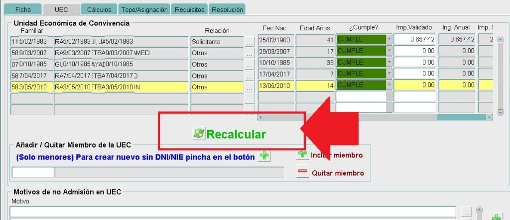 De ser así debe pulsar RECALCULO en la pestaña de Unidad Familiar.