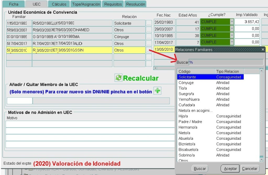 Para dejarlo bien, pulsaremos en el botón de lista de valores desplegando los posibles valores de relación familiar.