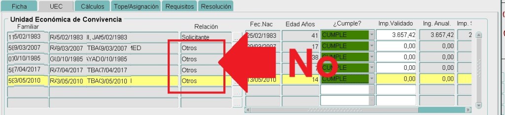 Todos los miembros de la unidad familiar deben tener definidas sus relación de parentesco con el solicitante. De dejar «Otros» el sistema identificará que no existe ninguna persona en esa unidad familiar que tenga la relación de Hijo o de Nieto a cargo, y por consiguiente la denegará al considerar que no existe ningún hijo o persona a cargo menor de 18 años.