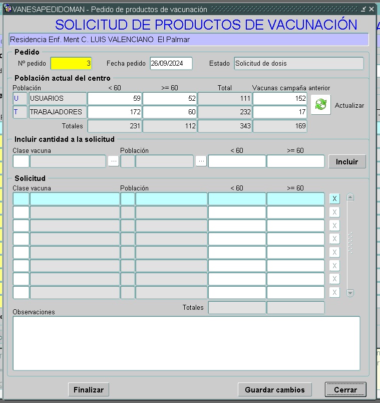 Una vez pulsamos este botón nos muestra el formulario electrónico para INTRODUCIR LA PETICIÓN, MODIFICARLA o FINALIZARLA para su envío a vacunas@carm.es.