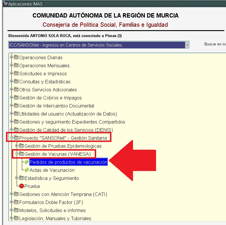 Para introducir las recepciones acudiremos al menú de ICC-SANSONET, elegiremos la opción de PROYECTO SANSONET Gestión de SANSONET, Gestión VANESA, opción Pedidos de productos de vacunación.
