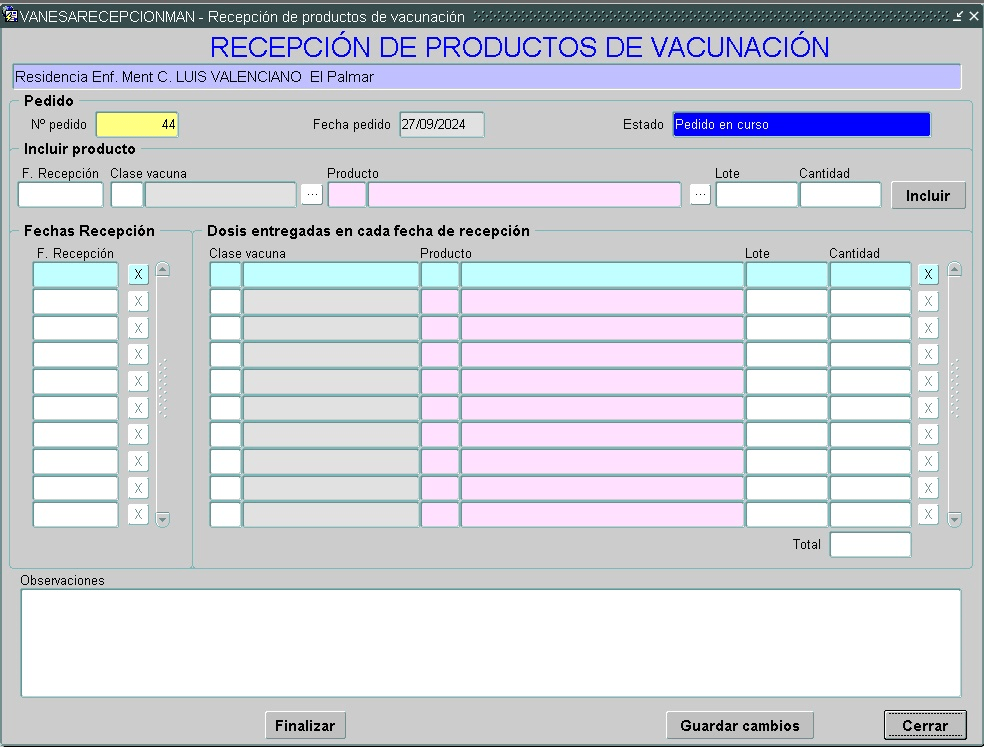 Para continuar con esta Fase, es necesario haber completado la Fase I, de solicitudes de productos de Vacunación, ya que las recepciones se realizan sobre una solicitud de Pedido de productos de vacunación realizada, y cuando decimos realizada, nos referimos que dicho pedido ha sido FINALIZADO, cuyo documento ha sido enviado a Vacunas, y por consiguiente nuestro pedido está en estado PEDIDO EN CURSO (de color azul).