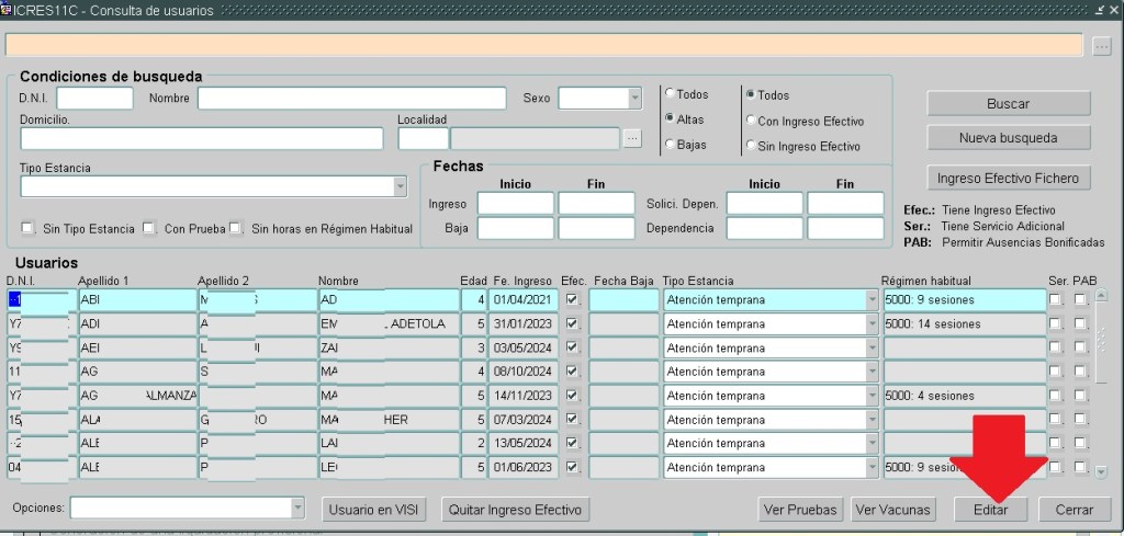Una vez, pulsemos esta opción nos situaremos en el niño/niña deseados y sobre él pulsaremos el botón de EDITAR. Una vez pulsado el botón editar el sistema nos mostrará la ficha del niño/niña.