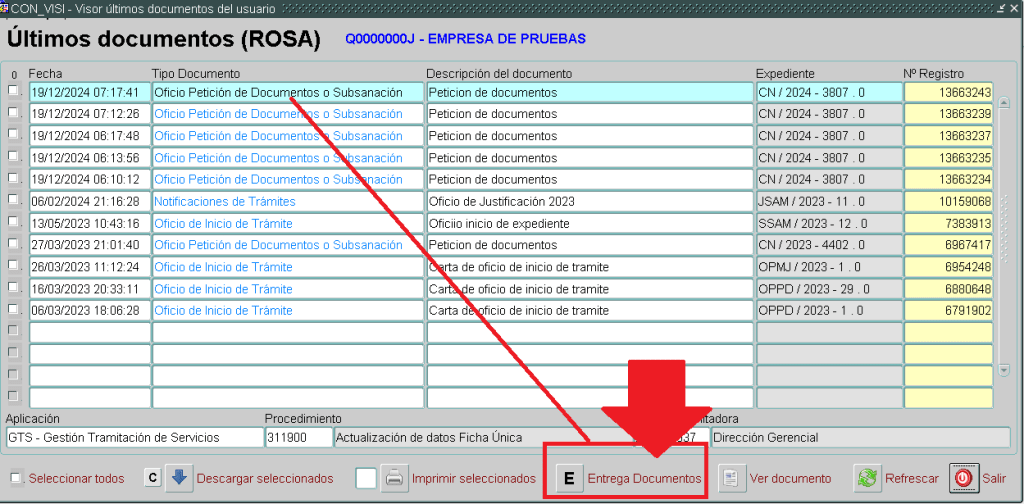 Una vez situada en la pestaña de ultimo documentos, pulsaremos el botón de entrega de documentos.