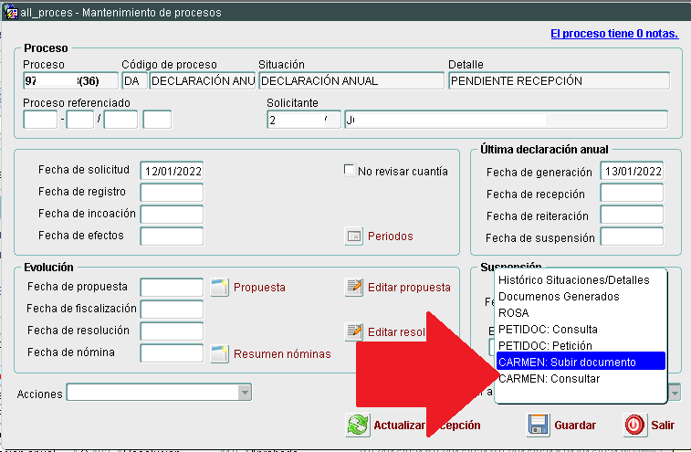 Crear una plantilla o generar un nuevo documento CARMEN (2), o ver los documentos generados, eliminar o editar uno creado (sin notificar) opción 3.