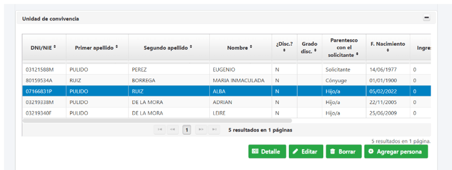 Los miembros beneficiarios se eliminan según se indica en la siguiente imagen. Primero se selecciona el miembro y a continuación aparecen diferentes opciones en verde, una de ellas BORRAR.