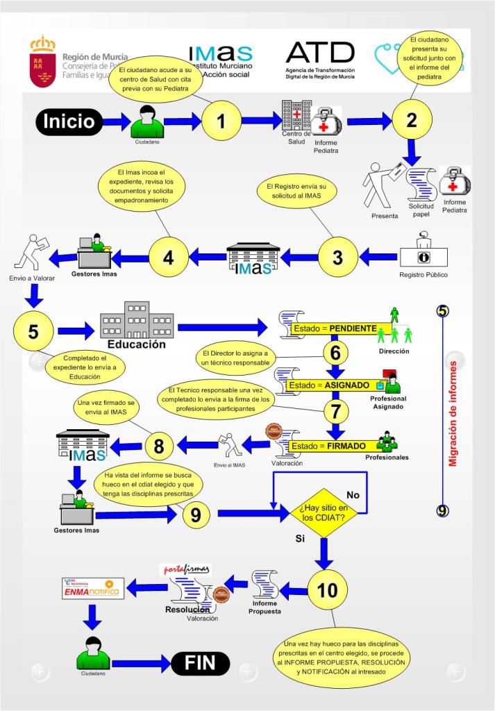 CUATRO, los gestores incoan la solicitud, comprueban la documentación aportada, solicitan por interoperabilidad el empadronamiento y en caso de no haber aportado el informe pediátrico, lo solicita por interoperabilidad al Servicio Murciano de Salud. De faltar documentación la solicita al interesado.