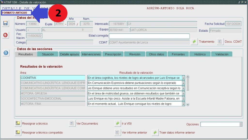 Si recuperáramos el informe que en su momento se hizo, nos saldría el mismo que en su momento se hizo y firmo, sin ninguna transformación, con el formato anterior, y si lo consultamos en la pantalla nos mostrará las pestañas antiguas, no las nuevas. Pero tanto en los antiguos como en los nuevos en la parte superior del formulario nos indicará de que formato se trata (2).