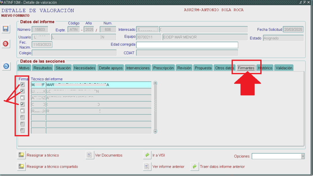 Para ello en la pestaña firmantes marcaremos con nuestro ratón los profesionales que firmarán este informe.