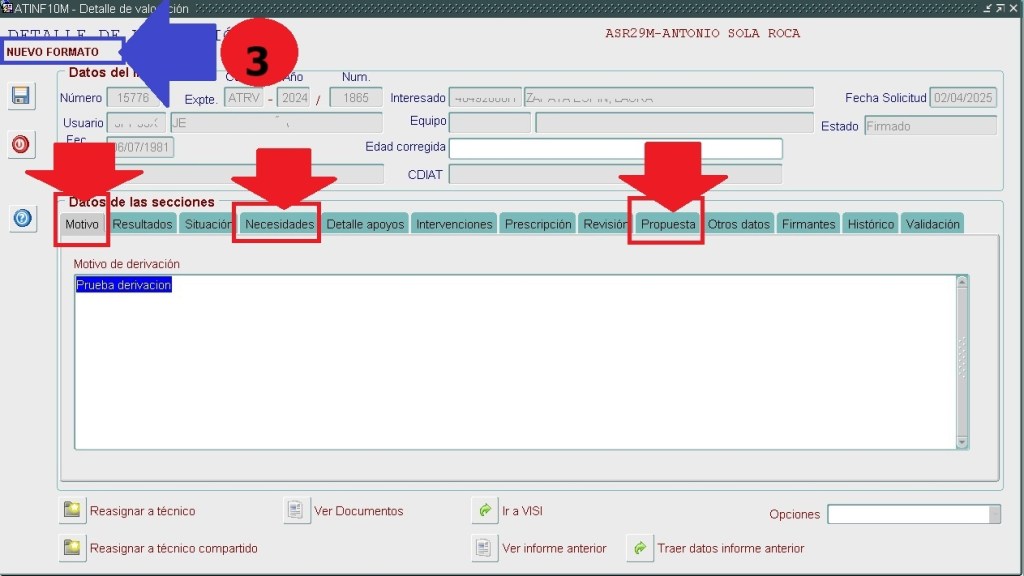 En este caso, encontraremos que al consultar para elaborar el informe en el sistema nos lo mostrará con el FORMATO NUEVO, aunque los apartados nuevos de pestañas no estarán rellenos . El nuevo informe que se generé una vez realizada la valoración será con MODELO NUEVO.