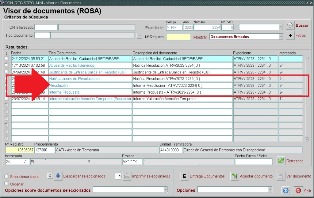 Una vez pulsemos el documento de ver documentos, veremos los documentos del expediente, y en él podremos ver si encontramos los documentos de INFORME PROPUESTA, RESOLUCIÓN y/o NOTIFICACIÓN que nos indican que dicho expediente ha sido Resuelto.