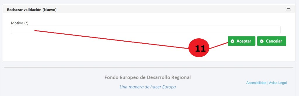 (8). Botón de RECHAZAR. Este botón le solicitará un motivo de rechazo y rechazará la validación enviando un correo al gestor de que no ha sido validado y el motivo.