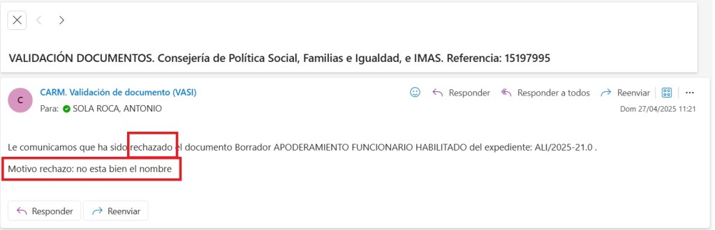 El documento no estará disponible, advirtiendo al gestor o solicitante que uno de los validadores lo ha rechazado y por el motivo que lo ha rechazado. Esto obligará al gestor a subsanar el motivo y volver a enviar a la validación el documento .