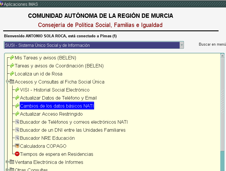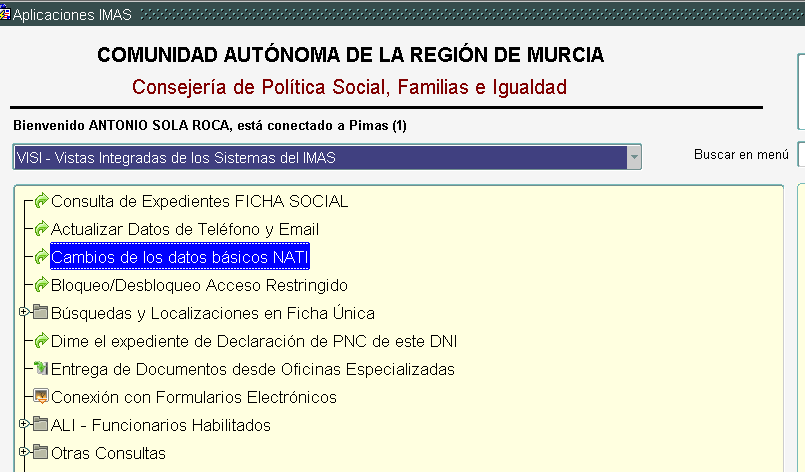 Podremos llegar a esta formulario de diversas formas, bien directamente desde opciones del menú en las plataformas VISI/SUSI, también desde la NATI en la Ficha Única Sociales bien porque en determinadas gestiones de expedientes encontramos un botón destinado a ello.
