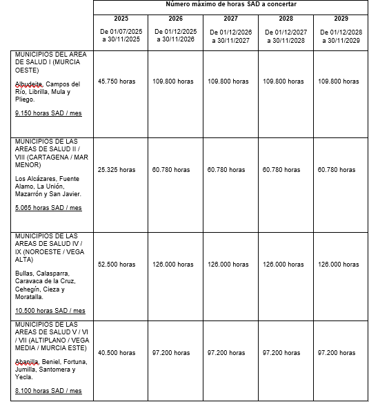 La oferta inicial de horas de SAD para personas en situación de dependencia, se ha organizado en torno a 4 áreas funcionales de municipios agrupados en torno a las áreas de salud a las que pertenecen. Las horas SAD a concertar para cada una de estas áreas se detallan a continuación: