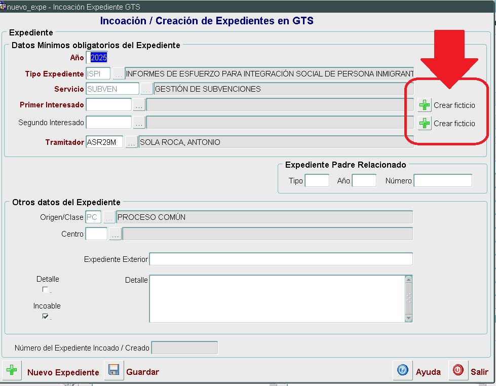 Pulsado este nos lleva a nuestra pantalla de apertura de expedientes donde los solicitará los identificativos de nuestros interesados, existiendo en la parte final derecha otro botón para crear identificativos «ficticios».