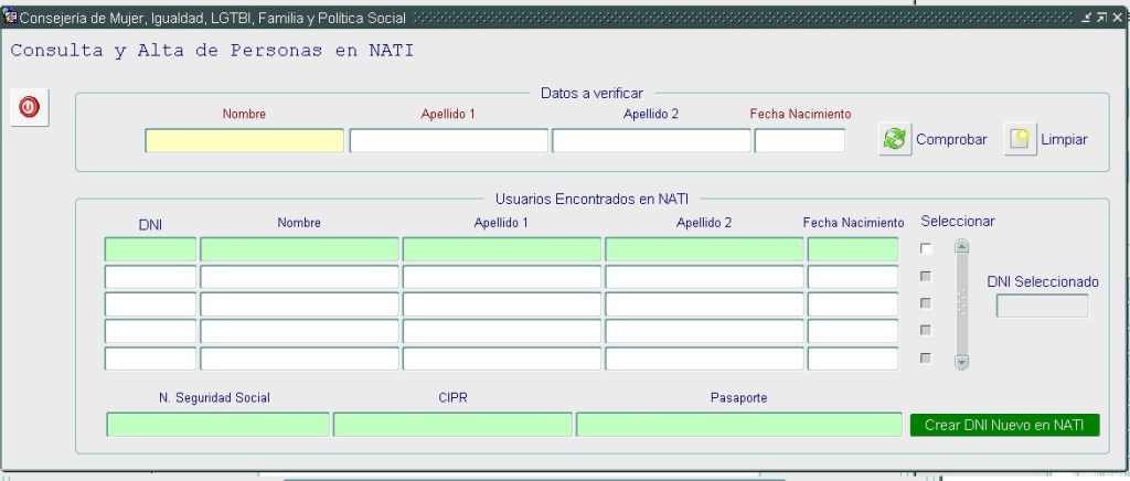 Al pulsar estos botones nos lleva a un sistema previo para fichas de personas que pueden ser la misma o que al menos tienen igual nombre, igual primer apellido e igual fecha de nacimiento. Esto nos permitirá comprobar que esta misma persona ya no se encuentra dada de alta en el sistema con otro identificador, incluso con uno válido que no conociamos.