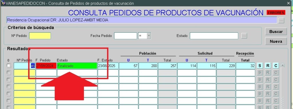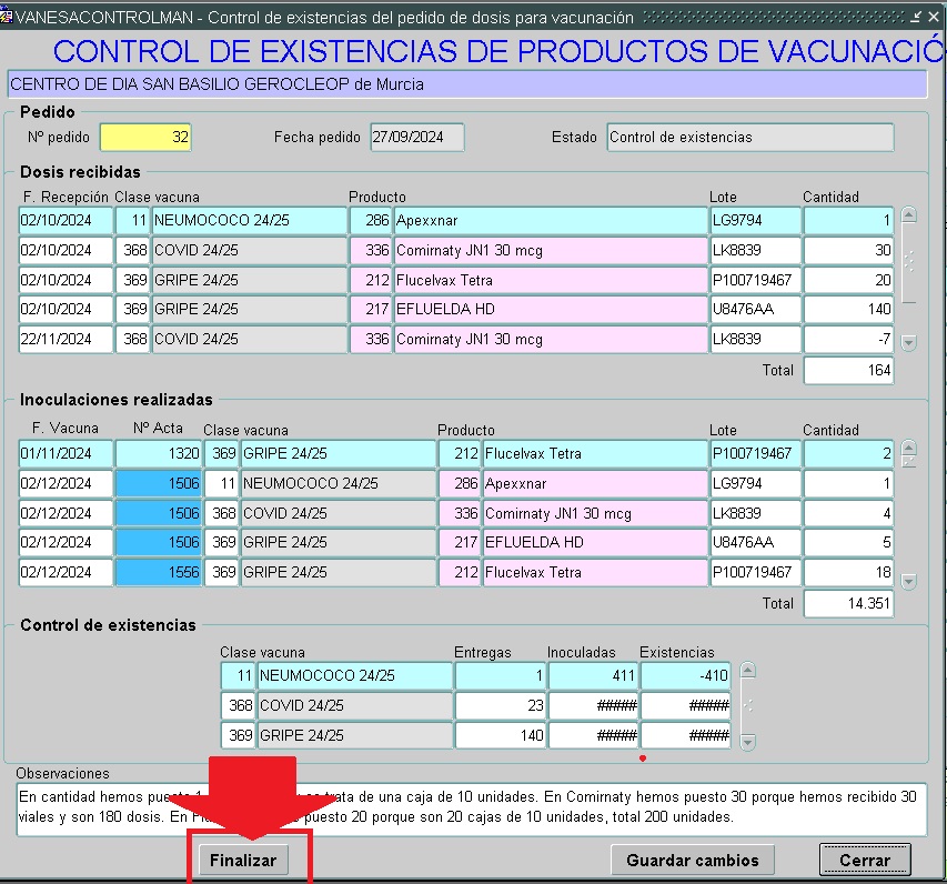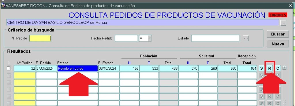 El proceso de Recepción de dosis se encuentra abierto durante toda la campaña ya que es posible volver a recibir nuevas dosis en el caso de nuevas incorporaciones o por no existir suficientes dosis de un mismo lote. Por ello antes de comenzar nuestra nueva campaña se hace necesario el cierre de recepción. Encontraremos que nuestro pedido inicial de campaña anterior se encuentra en la situación de PENDIENTE EN CURSO.