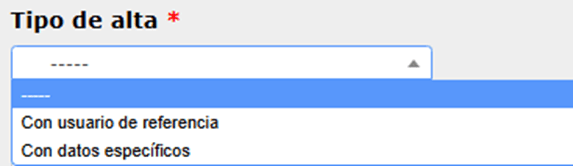 b. En tipo de alta especificar Con usuario de referencia si ya existe un usuario de dicha empresa o Con datos específicos si es el primero que se solicita de dicha empresa: