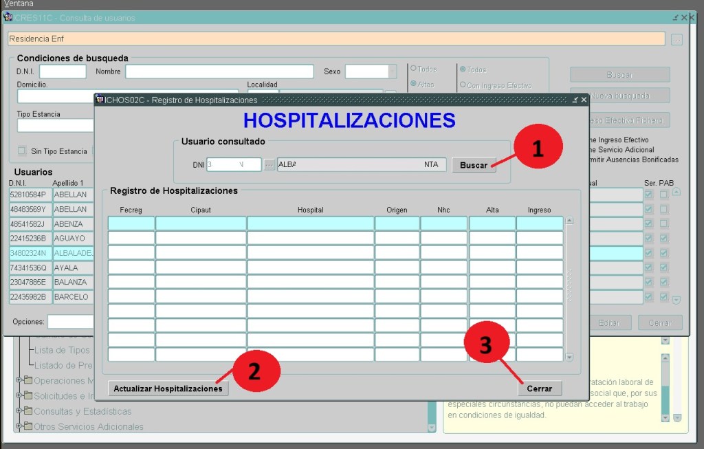 1. Botón de BUSCAR. pulsaremos y nos traerá las hospitalizaciones hasta el momento registradas.