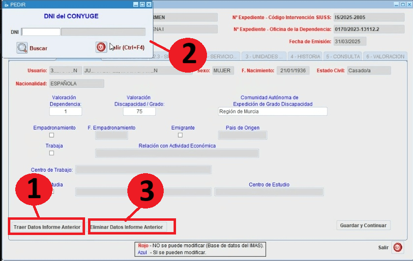 De indicar sí, el sistema nos solicitará el DNI de la persona de la que queremos traernos su último informe (2). De equivocarnos y desear borrar los datos que nos hemos copiado, tenemos el botón (3) que borra de nuestro informe los datos trasladados.