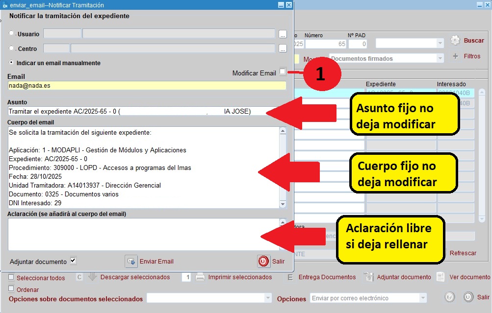 Con anterioridad, cuando desde ROSA elegíamos enviar el documento por correo el sistema nos mostraba los textos de Asunto y Cuerpo fijos con un texto que no podíamos modificar. Sólo nos permitía escribir el texto que quisiéramos poner en el apartado de Aclaraciones