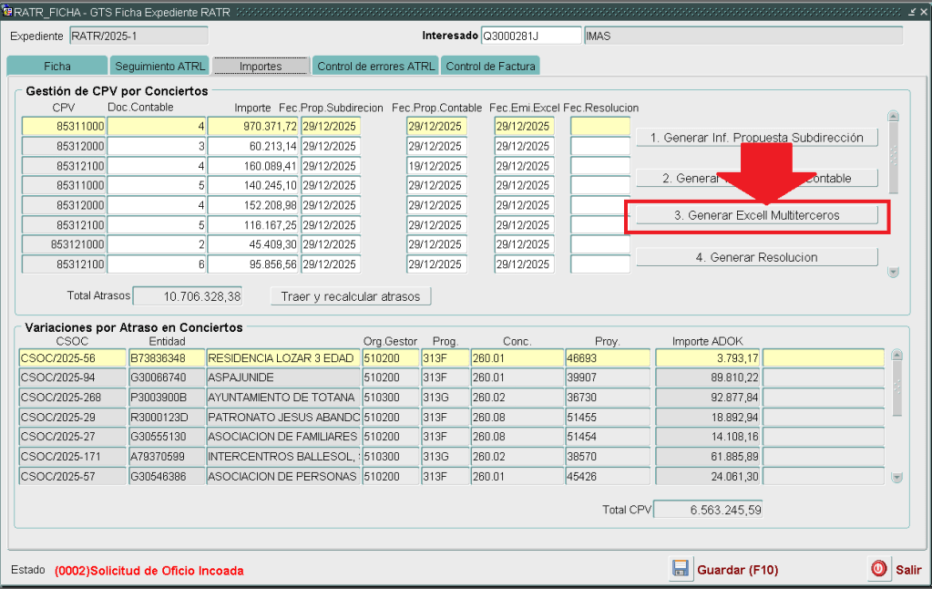 PASO 13. GTS estado 9900. El sistema creará un expediente VSOC por cada expediente ATRL, recalculado las cantidades a incrementar los A+ y D+ (segunda parte) para que a través de la gestión de GTS se hagan los correspondientes documentos plurianuales.