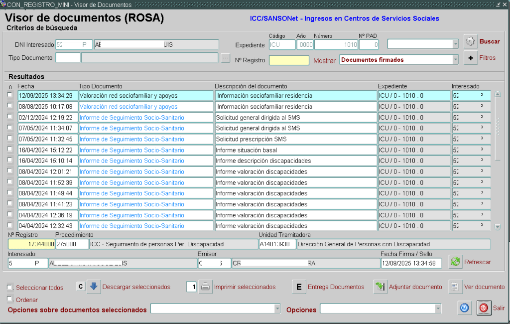 Documentos del usuario de ROSA. Visor del archivo electrónico de este usuario del servicio de los documentos generados, subidos o gestionados a través de ICC/SANSONET u otros expediente relacionados.