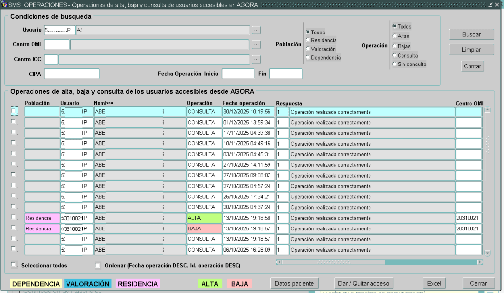 Consultas de altas/bajas del SMS. Muestra el histórico de Altas y Bajas como paciente de la población en AGORA