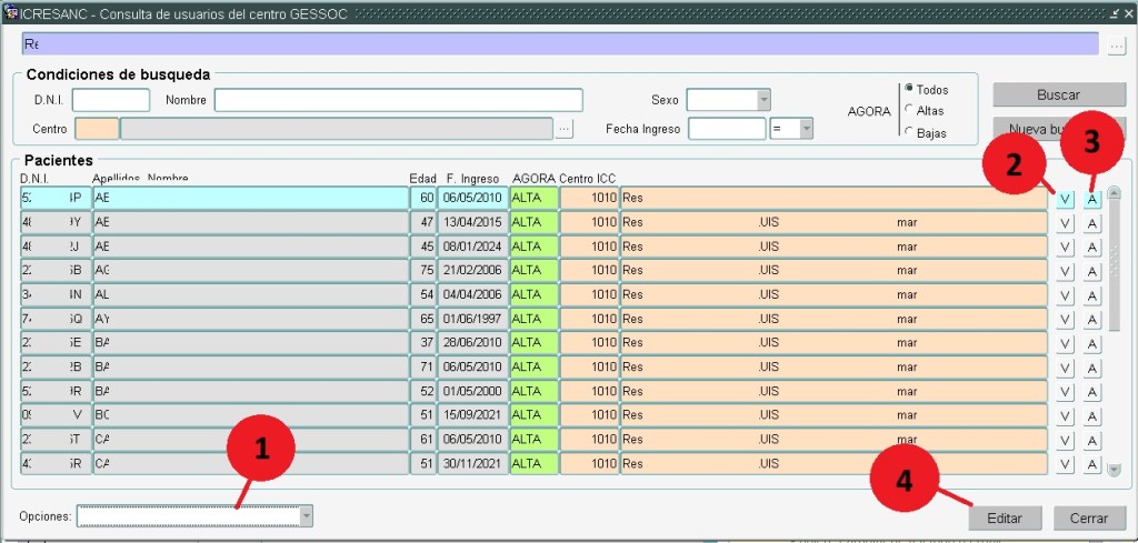 En ella encontraremos a los Usuarios del Centro Físico (varios centros ICC que comparten espacio). Nos mostrará su DNI, Nombre, edad, fecha de ingreso y si sus datos son o no consultables en AGORA.