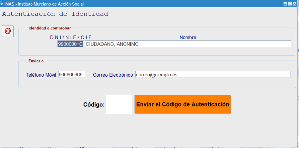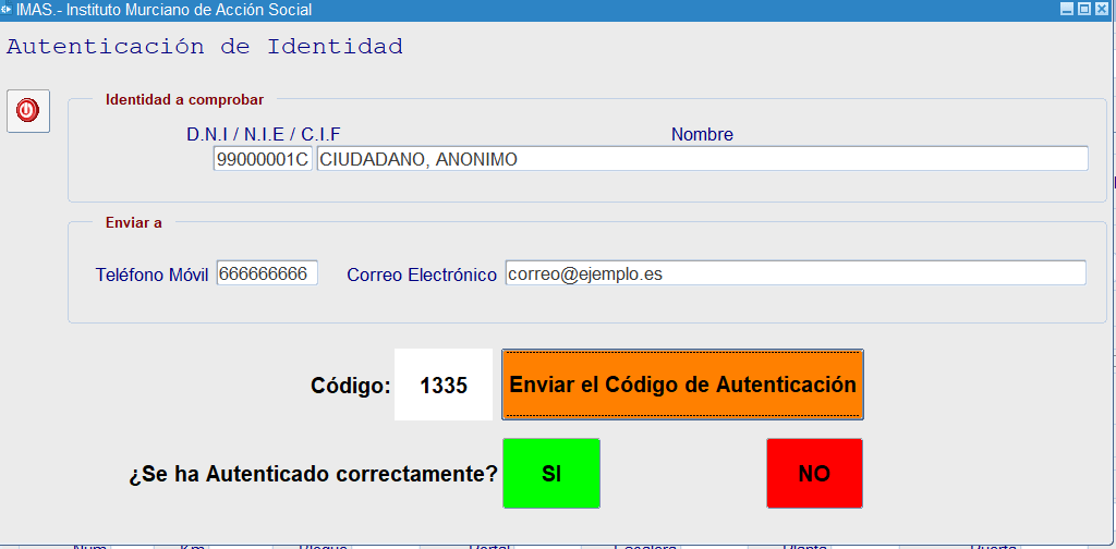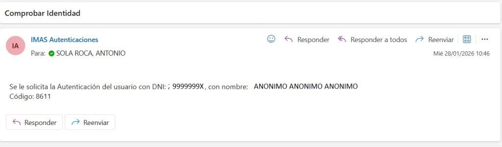 El sistema procederá a enviar un código numérico de 4 dígitos calculado al azar al móvil indicado y al correo electrónico facilitado. Al destinatario o interesado sobre el que estamos comprobando su identidad, le llegará el siguiente correo a su email, y el mismo texto y código por SMS a su móvil.